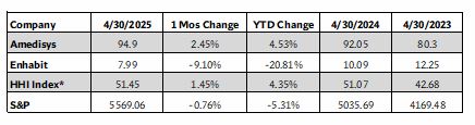 In April 2025, the Home Health Index (HHI) rose 1.45% bringing its total year-to-date (YTD) gain to 4.35%. The Post-Acute Care Index (PAI) gained 2.65% month-over-month (MoM), though it remains down 5.53% YTD. Meanwhile, the S&P 500 fell 0.76% MoM and is down 5.31% YTD.