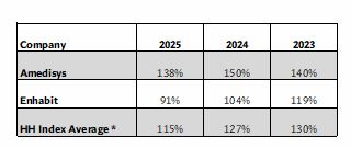 The Stoneridge Partners Home Health Index (HH Index) is updated monthly and measures the performance of these two publicly traded home health companies, all listed on the NASDAQ: