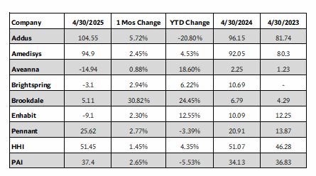 Brookdale was one of the PAI’s top performing companies in April with a 5.11% monthly gain and a strong 30.82% YTD increase in stock price. Brookdale appeared pleased with its Q1 2025 results. Denise Warren, Brookdale’s Interim Chief Executive Officer and Chairman stated, “Our solid first quarter results and annual guidance raise are a testament to the significant momentum underway at Brookdale as we continue to meet the diverse needs of the large aging older adult population.”