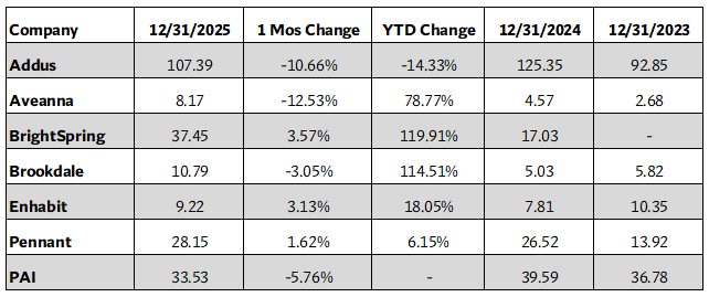 The Stoneridge Partners Post-Acute Care Index is updated monthly and measures the performance of these six publicly traded post-acute care companies, all listed on the NASDAQ: