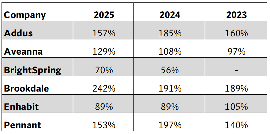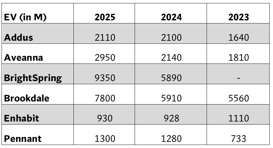 The above calculations are based on the selling price being defined as Enterprise Value (EV), with data provided by Yahoo Finance. Enterprise value is defined as market cap plus debt, minority interest, and preferred shares, minus total cash and cash equivalents. EBITDA is calculated using a methodology that may differ from that used by a company for its reporting. (Home Health Index December 2025 | Stoneridge Partners)