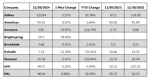 The other public company on the HHI, Enhabit Inc. (NYSE: EHAB), had a solid month after its stock sank significantly in the early autumn. Enhabit was up 12.19% in November but is still down significantly year to date.